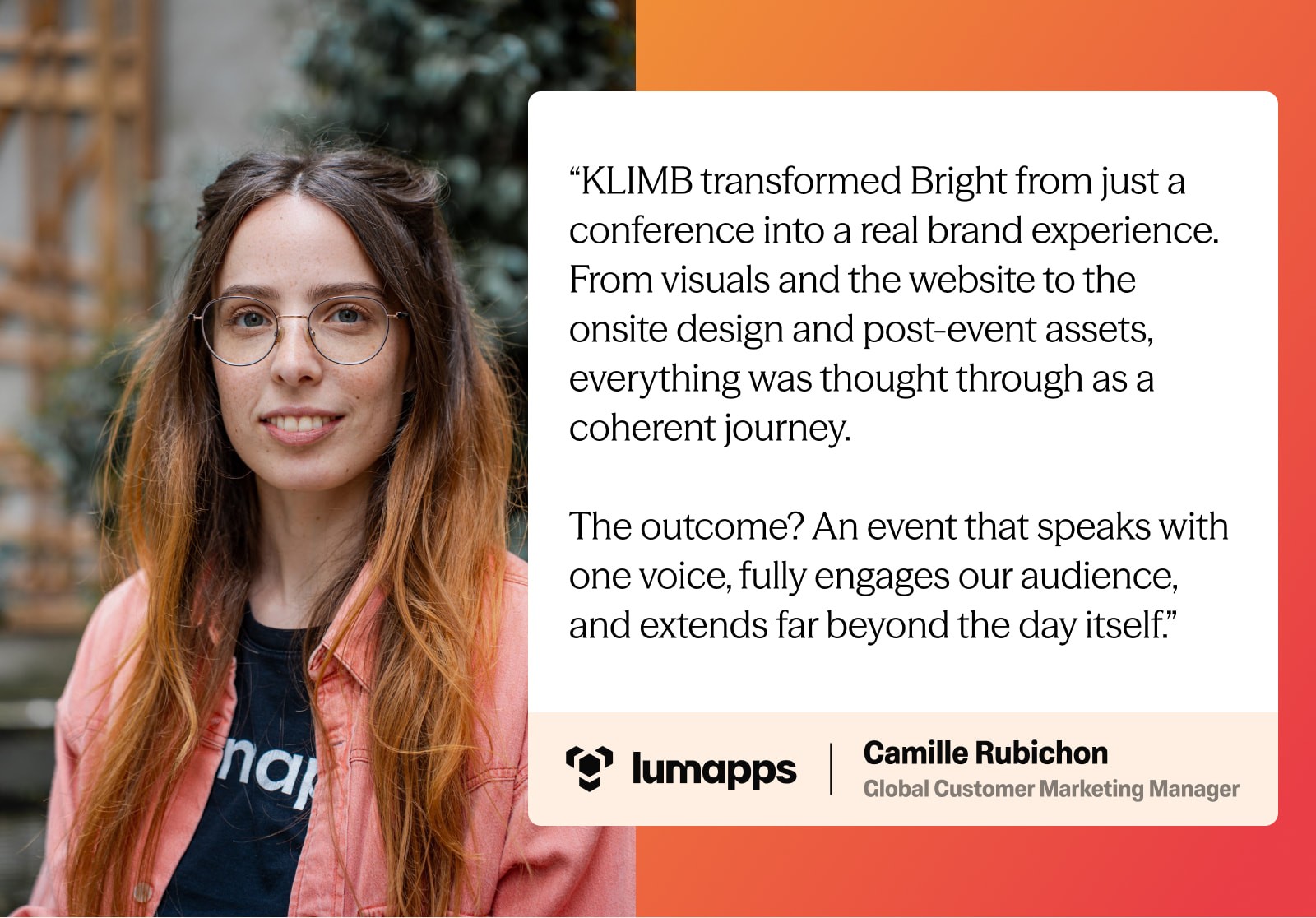 Bright isn’t just a conference. It’s where LumApps brings together the brightest voices in Employee Experience to share insights, challenge assumptions, and drive meaningful change. In 2025, LumApps expanded the experience in both Paris and Chicago to set the tone for what Bright could become: a branded platform that connects content, community, and vision across markets. KLIMB designed a complete identity for Bright, as if building a standalone brand - from visual language to digital presence, on-site experience to post-event rollout. The result: an event that speaks with its own voice, while fully reflecting LumApps’ ambition.