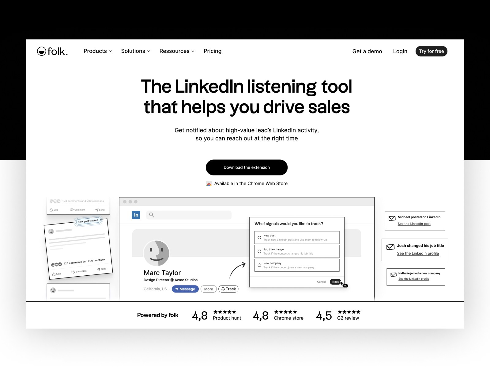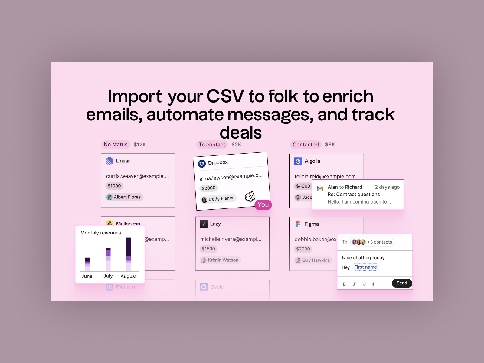 Folk is a collaborative CRM designed to simplify relationship management for teams and individuals. With a user-friendly interface, it empowers users to organize and manage contacts more efficiently, streamlining communication and enhancing productivity across personal and professional networks.